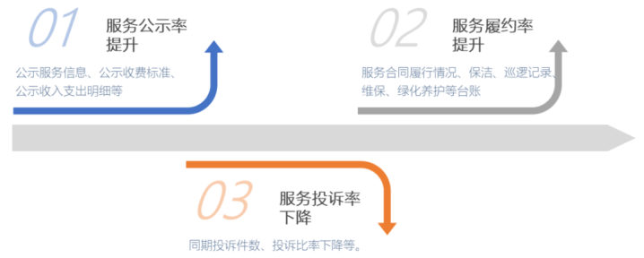 为落实全国住房城乡建设工作会议“大力实施物业服务质量提升行动”工作要求,各地纷纷进行相关政策的制定。政策主要聚焦在三方面:服务公示率提升、服务履约率提升和服务投诉率下降。