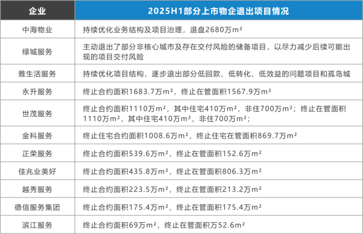 2025年上半年,物业管理行业悄然掀起一股“撤退潮”,头部物企纷纷主动剥离规模庞大却质量不佳的项目,中海物业退盘面积高达2680万m²,永升服务、世茂服务、金科服务等企业退出项目也均超过千万m²。